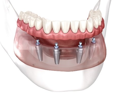 All-on-4 diş implantları, tam bir diş kemerini desteklemek için stratejik olarak yerleştirilmiş yalnızca dört implant kullanır; bu, genellikle altı ila sekiz implant gerektiren geleneksel implant destekli protezlere göre önemli ölçüde daha azdır.